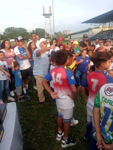 Al final Cabruja se tomó fotos con los bebés, con el profesor Omar Cubillán Ávila y el maestro internacional de la percusión Franklin Veloz, el famoso Jerry que pitó más de 52 Campeonatos de fútbol menor.