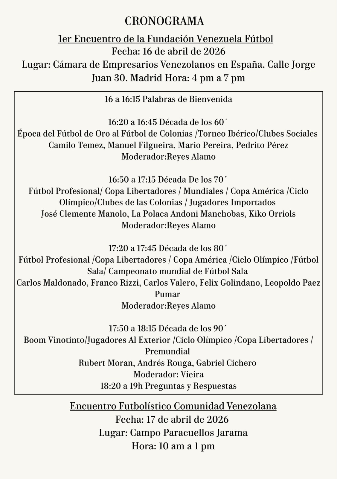 Parte vital de esa labor es la celebración del Primer Encuentro de la Fundación Venezuela Fútbol en Madrid, programado para realizarse los días 16 y 17 de abril, con un cronograma de actividades y una exquisita lista de ponentes y protagonistas que les proporcionamos en los anexos a esta nota de prensa.