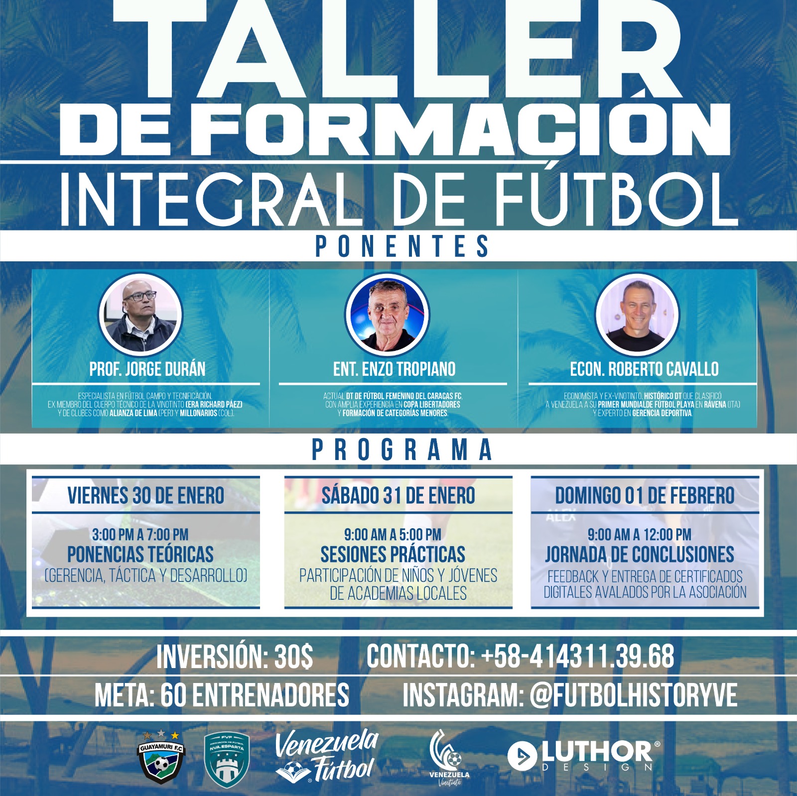 Continuando con su extensa programación de este año 2026, La Fundación Venezuela Fútbol Historia anuncia el inicio de su programa de capacitación técnica con un Taller de Actualización de Formación Integral en la Isla de Margarita, del 30 de enero al 1 de febrero. Este evento contará con la participación de tres figuras emblemáticas del balompié nacional: los profesores Jorge Durán, Roberto Cavallo y Enzo Tropiano.