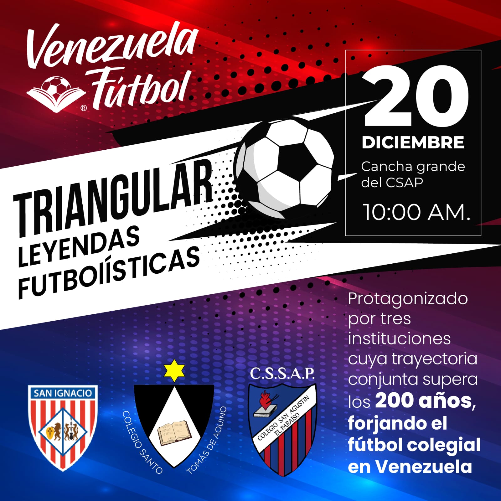 Tres de los colegios más emblemáticos de Caracas: San Ignacio de Loyola, San Agustín de El Paraíso y El Santo Tomás de Aquino, jugarán este 20 de diciembre un Triangular Decembrino organizado por la Fundación Venezuela Futbol Historia, con la idea de institucionalizar el evento todos los años.